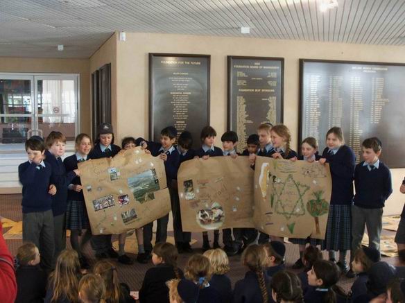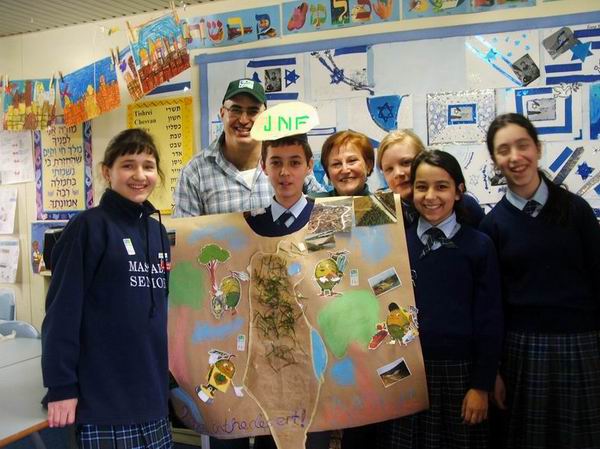 | YEARS 6/7 WITH SOME OF THEIR WORK left to right - Sarah Rubinshtein, Saar Most (JNF Education Shaliach), Adam Mezhvinsky, Anne Bayer (JNF-SA President), Emma Phillips, Liat Kedem, Mushki Engel. |
